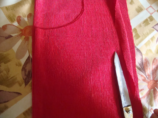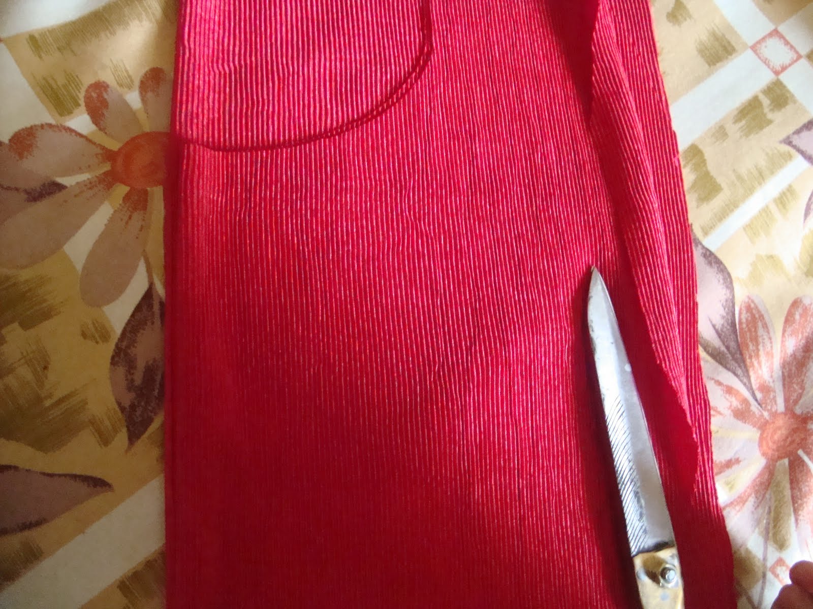 I have this lovely printed fabric with BIIIIIG holes in it which set off the red of the corduroy perfectly.I cut 2 pieces 3.5" by 20" from this fabric.You can skip this step if you do not want it.This is how all the cut pieces will look like.